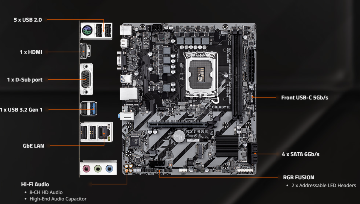 מפרטים לוח Gigabyte H810M H 1.0 Micro-Atx DDR5 LGA1851 VGA HDMI