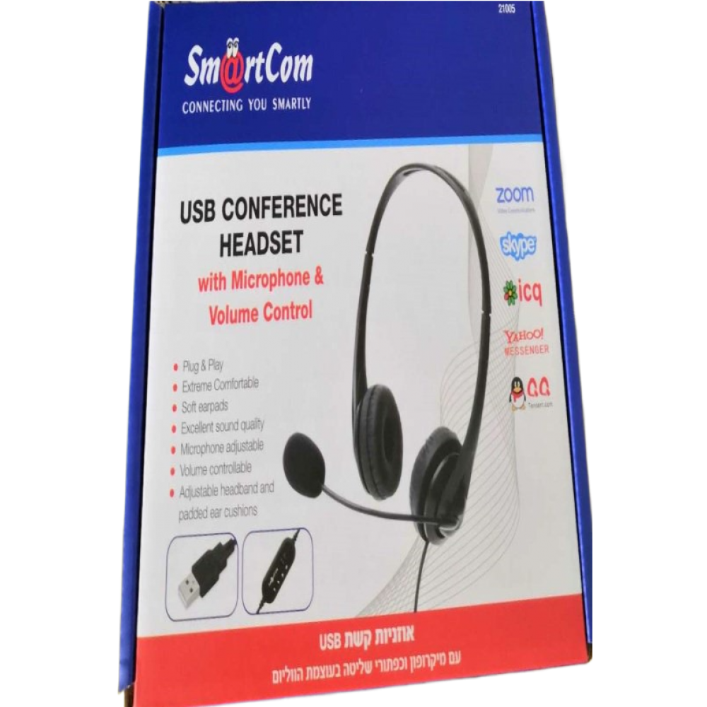 אוזניות קשת וכפתורי שליטה בעוצמת הווליום וכבל USB למחשב